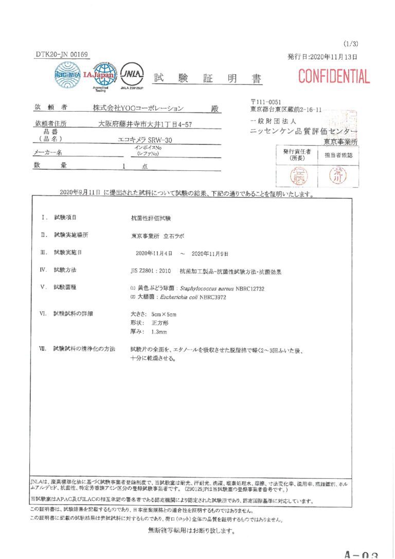 與未經加工產品表面相比,細菌的增殖比例必須在1/100以下,並且通過耐久性檢驗,確認具備抗菌效果。